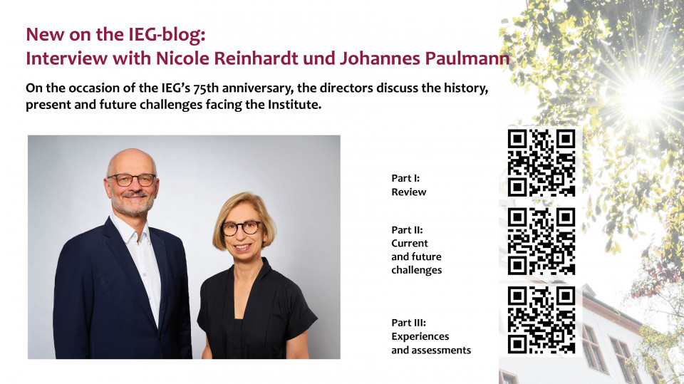 To mark the 75th anniversary of the Leibniz Institute of European History (IEG), the IEG Blog has published a three-part interview with the Institute’s directors, Nicole Reinhardt and Johannes Paulmann.